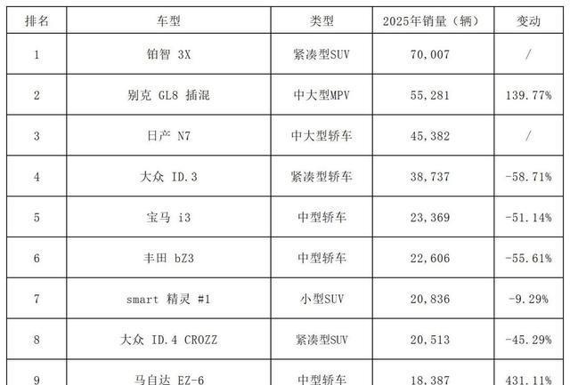2024年销量达到93,816辆,排在合资新能源车榜单第一位,2025年销量同比58.7%锐减至38,737辆,排名下滑至第四。尽管3月份推出车机系统升级优化的“聪明版”,6月追加GTX套件款,升级运动化外观套件。但由于核心三电能力、外观造型等未做调整,加之受到蔚来萤火虫、零跑 Lafa5 等中国品牌同类车型的冲击,并没有在市场激起太多的水花。